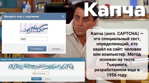 Капча (англ. CAPTCHA) — это специальный тест, определяющий, кто зашёл на сайт: человек или компьютер. Метод основан на тесте Тьюринга, разработанном еще в 1956 году. Слово CAPTCHA — это аббревиатура от Completely Automated Public Turing Test To Tell Computers And Humans Apart, что в дословном переводе значит «Полностью автоматизированный публичный тест Тьюринга для различения компьютеров и людей». Но русский язык впитал в себя эту аббревиатуру и теперь мы произносим её прямо в транскрипции, как единое слово...