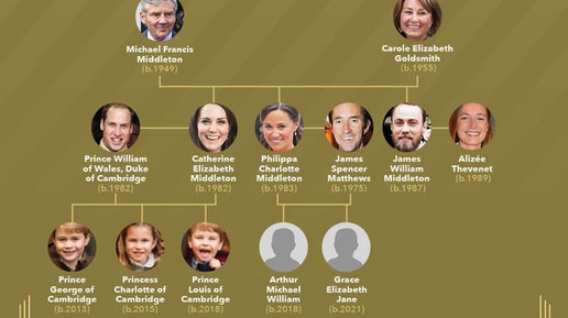 a family tree - cемейное древо b. - cокращение от слова born (рождён) Занимательно, что у самой Кейт, а также у её брата, сестры, отца и матери - у них у всех есть middle name - второе имя. Саму Catherine также зовут Elizabeth, сестру Филиппу (Philippa) вторым именем...