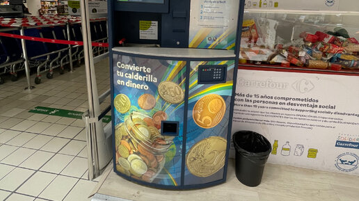 Всем привет! Часто, находясь в Европе, копятся мелкие монеты по 1 или 2 евроцента, обычно их сдают терминалы на платных дорогах после оплаты проезда. Такие мелкие монеты и таскать с собой не будешь, и в магазин в пакете не принесёшь (как-то неудобно). В Испании мы нашли способ, как от них избавиться с пользой для себя. На этот терминал мы обратили внимание совсем случайно. И потом подтвердили свои догадки. Он принимает мелкие евроценты. Было решено попробовать сдать накопленное вместе с детьми. Им это особенно интересно...