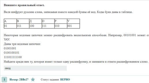 Валя шифрует русские слова, записывая вместо каждой буквы её код. Коды букв даны в таблице. Некоторые кодовые цепочки можно расшифровать несколькими способами. Например, 00101001 может означать не только УРА, но и УАУ. Даны три кодовые цепочки: 01001001 0100100101 111011111100 Найдите среди них ту, которая имеет только одну расшифровку, и запишите в ответе расшифрованное слово. РЕШЕНИЕ 1) 01001001 Расшифруем слева направо 01, буква А 001, буква У 001, буква У 01(А)001(У)001(У) Расшифровываем справа...