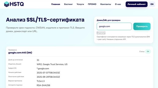 Разбор инструмента SSL checker на пальцах 1. Что это вообще? Онлайн‑инструмент для проверки SSL‑сертификата твоего сайта. Работает быстро, напрямую, без всяких посредников. Самое честное рукопожатие через TLS - https://hstq.net/ssl-check.html 2. Что ты вводишь? Любой домен, можно с портом (например, example.com:8443), можно полный URL. Жмёшь “Проверить”. 3. Что он тебе показывает? • Сколько дней осталось до окончания сертификата (чтобы не проспать дедлайн). • Кто выдал сертификат (Issuer). • Subject CN — основной домен...
