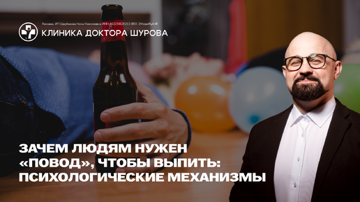 от врача-психиатра и нарколога Василия Шурова Если внимательно присмотреться к тому, как люди пьют, становится заметно: большинство делает это не потому, что испытывает реальное желание. Они пьют потому, что есть повод. Причём поводы иногда звучат так, будто их придумывали на ходу: день рождения соседа, «давно не виделись», усталость «выше нормы», хорошая новость, плохая новость, пятница, вторник, просто «ну а почему бы и нет». И эти «поводы» куда важнее самого алкоголя. Они выполняют психологическую функцию, которую редко осознают — и именно поэтому она так мощно работает...