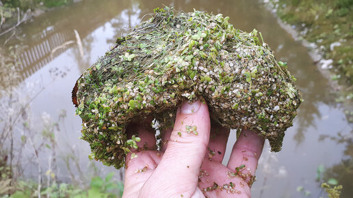 Не так давно я опубликовал статью про свой новый водоём с карасями, где они неплохо расплодились в первый же год. В комментариях под той статьёй проходило серьёзное обсуждение жизни карасей, и один из встречающихся вопросов - а чем кормить карасей в пруду? В общем-то, если водоём старый, то в нём карась сам найдёт чем кормиться, но вот в новом водоёме пищи может быть не много... На фото выше я держу в руке свеженькую порцию корма, которую сейчас закину в новый водоём. Это ряска с маленького водоёма...