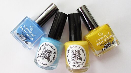 Здесь я наглядно покажу вам на фотографиях, почему же всё-таки лучше использовать в стемпинге именно специальные краски, нежели обычные лаки для ногтей: краски намного насыщеннее и плотнее обычных плотных лаков-однослойников. Все фотографии давнишние, вот эти я делала в 2016 году. Речь идёт про лаки для ногтей Golden Rose Rich Color и краски для стемпинга Kaleidoscope by El Corazon Вот они, мои флакончики - Цвета практически одинаковые, лаки Golden Rose у меня и ярче, и насыщеннее выглядят во флаконах, чем флаконы с красками для стемпинга Kaleidoscope...