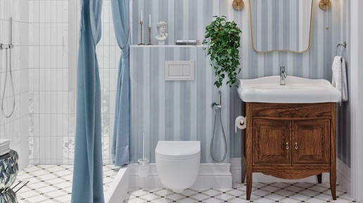 Чем отделать стены в ванной, кроме плитки? Плитка в ванной необходима, но большую часть можно отделать другими влагостойкими материалами. Например: покрасить стены специальной краской! Как мы и сделали в нашем новом проекте #градиз_танец_парижа. ✔️ Стены мы окрасили в нежный голубой цвет в полоску, что визуально расширило пространство и добавило лёгкости. ✔️ В зоне, где особенно много воды, использовали классический «кабанчик» от Equipe - матовый на стенах и глянцевый на полу - для красоты и практичности...