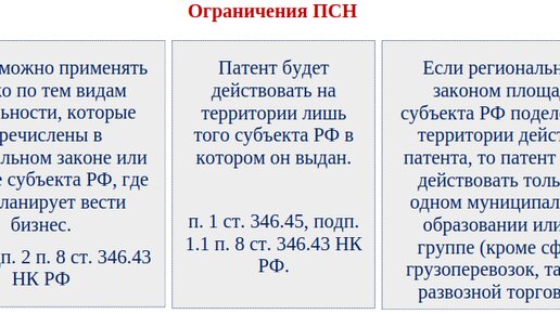 Территориальные и иные ограничения На ПСН есть существенные региональные ограничения: Если ИП на ПСН продаст основное средство (даже разово) или получит выручку от торговой точки, не указанной в заявлении на патент, с полученных доходов придется уплатить налоги в рамках другого налогового режима. На УСН территориальных сложностей нет – система применяется по всей деятельности ИП в целом вне зависимости от территории ведения бизнеса. Так как упрощенка действует на всей территории РФ, региональные власти никак на это не влияют...