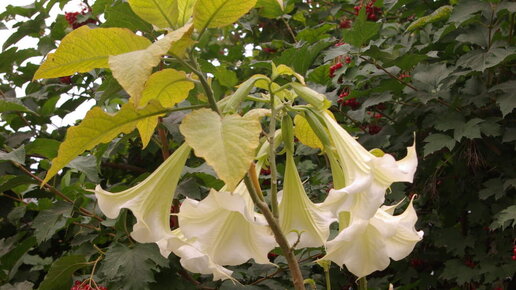 Несколько лет назад удалось посадить БРУГМАНСИЮ. Сначала пыталась посеять семенами из магазина! Не взошли! Позже приобрела саженцы у любителя. В прошлом году уже красиво цвела, осталась довольна, хотя продавец обманул по цвету - вместо розовой и персиковой получились обе белые. Но, цветут очень красиво! Зимуют они у меня дома подальше от окна. Листьев зимой на них нет, но ближе к весне начинают прорастать некоторые почечки. На днях нарезала черенков на укоренение. Поздновато, но уж так получилось!...
