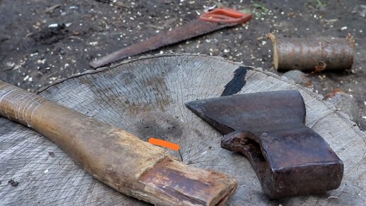 Народ всем привет! Сегодня хочу поделиться с вами одним очень интересным способ насадки топора на топорище. Можно конечно, как наши деды, хранить топор в грязном ведре с водой, но нужно идти в ногу со временем. Суть способа очень проста и повторить сможет каждый. Для примера я буду использовать вот такой вот старый топор, который повидал еще советскую, беззаботную жизнь Первым делом я сниму топорище и отпилю не годную часть. Может этого делать и нельзя, но я буду использовать этот топор в гараже для растопки печи...