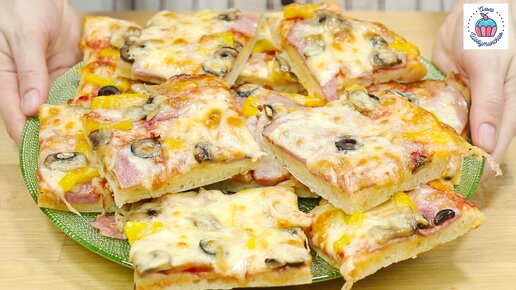 Готовим домашнюю пиццу на весь противень, для большой компании! Тесто будет пышное, а сама пицца сочная, мягкая и очень вкусная) *тесто подойдёт и для тонкой пиццы, просто нужно разделить его на две части и сформировать 2 круглые пиццы. Классическое тесто для пиццы: В тёплой воде растворяю дрожжи и сахар. Всыпаю соль и вливаю масло. Теперь добавляю муку и замешиваю тесто. Сначала оно будет липкое, но со временем соберётся в комок и будет отставать от рук и стенок миски. Вымешиваю несколько минут до гладкого комочка...