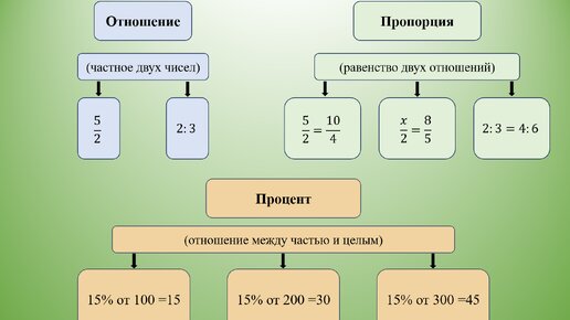 В реальной жизни мы часто сталкиваемся с соотношениями. Давайте разберемся с понятиями отношений, пропорций и процентов, научимся вычислять их. Отношения Отношение – частное двух чисел. Оно показывает, во сколько раз одно число больше другого. Отношения могут быть абсолютно разными, взаимно заменяемыми (две равные дроби, но с разными числами в числителе и знаменателе) и взаимно обратными (числитель первой дроби равен знаменателю второй, а знаменатель первой дроби равен числителю второй) Пропорции Пропорция – равенство двух отношений...