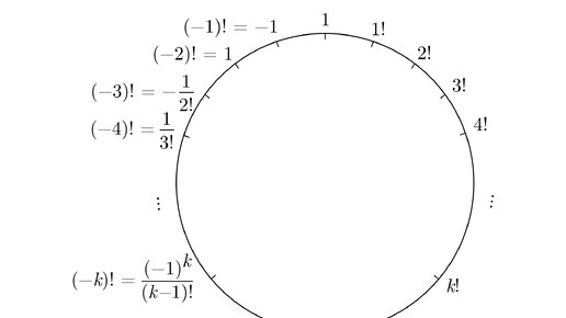 Если честно следуя определению, попытаться посчитать факториал от отрицательного числа, то ничего не получится: убывающий ряд целых чисел никогда не закончится и ни к какому результату мы не придëм. Однако в конечных арифметиках результат получится вполне определëнным. В предыдущей заметке мы упомянули теорему Уилсона которая говорит чему равен факториал наибольшего числа в модулярной арифметике с простым модулем: Но эта теорема ничего не говорит нам о том, как выглядят прочие факториалы, если вычислять их в конечном поле ℤ/pℤ...