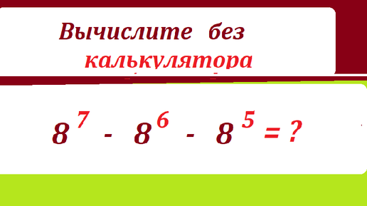 Приветствую читателей и подписчиков канала Тесты_математика! Рассмотрим такую задачу на вычсление выражений без применения калькулятора. Задача. Вычислите без калькулятора этовыражение: 8^7 - 8^6 - 8^5 Условие задачи на рисунке. На нашем канале кроме решения в обычной форме мы показываем решение в виде скриншотов с экрана видео и в видео...
