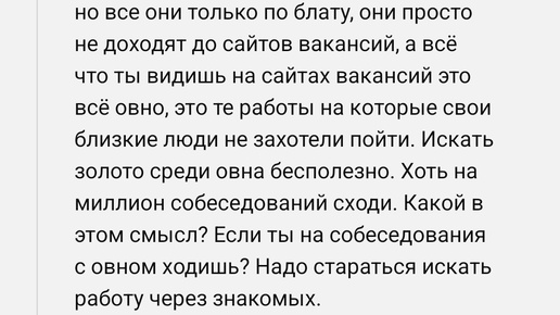 «Хорошие работы есть, но все они только по блату, они просто не доходят до сайтов вакансий, а всё что вы видите на сайтах вакансий это всё мусор... Искать золото среди шелухи бесполезно. Надо стараться искать работу через знакомых.» Жестко, да? Но насколько это правда в Москве? Сразу скажу как человек, который сам искал и нашел подработку курьером: полностью отмахиваться от сайтов вакансий — это ошибка. Да, процент "шлака" (это слово вы оставили, оно хорошо передает смысл), устаревших объявлений и вакансий с неадекватными требованиями огромен...