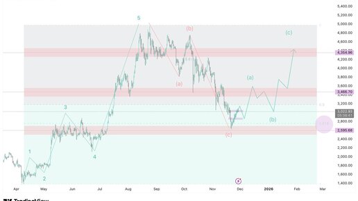 Что будет с эфиром в декабре? сохраняем себе годноту Что на графике? 1) Слева, зеленая 12345 = 5-волновый импульс от 1370 до 4950, апрель-август 2025 2) По центру, красная ABC = 3 волны коррекции роста, от 4950 до 2650, август-ноябрь 2025 3) Справа, зеленая ABC = 3 волны коррекции падения, от 2650 до 4300, ноябрь-февраль 2026 Что еще? 1) Весь рост 1370-4950 эфир откорректировал по золотому сечению 0,618, отметил фиолетовым кругом. Это самая часто встречающаяся глубина коррекции в крипте, поэтому вероятность смены тренда с нисходящего на восходящий вырастает...