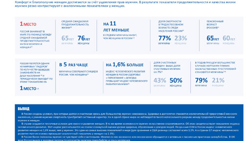 Сейчас очень распространено мнение, что мы живем в матриархально-феминизированном обществе, где женщины являются привилегированной социальной группой, а мужчины – людьми «второго сорта». Создаются условия, при которых мужское население России вымирает. В то же время женщины получают доступ ко всё большему количеству социальных благ. Усиливается экономическая эксплуатация мужчин. Работают механизмы несправедливого перераспределения результатов мужского труда в пользу женщин (например, алиментная система и система страховых пенсий)...