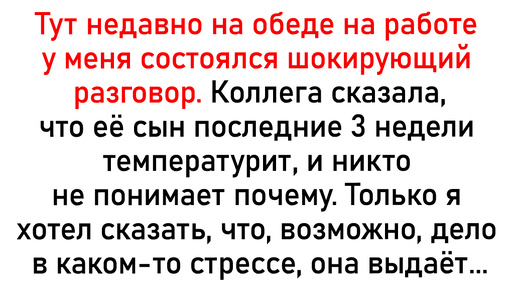 Тут недавно на обеде на работе у меня состоялся шокирующий разговор. Коллега сказала, что её сын последние 3 недели температурит, и никто не понимает почему. Только я хотел сказать, что, возможно, дело в каком-то стрессе, она выдаёт: «Да, он стрессует, ведь недавно сделал предложение своей девушке». Ну я сказал, мол, бывает, что у людей такой серьёзный шаг вызывает стресс. Но она ответила: «Это я на него давлю. Ведь они живут уже 2 года, и я поставила условия — либо брак, либо расход». Я не поверил своим ушам...