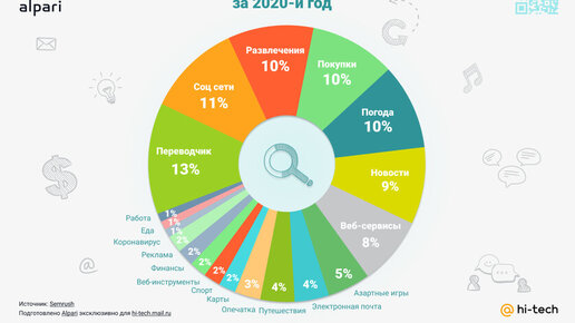 Согласно данным одного из популярных сервисов аналитики поисковых запросов, за прошлый год в глобальном рейтинге топ-100 запросов лидировали запросы на тему: социальные сети, видео-сервисы, мессенджеры, онлайн-кинотеатры, почтовые сервисы, погода, онлайн-переводчики, интернет-магазины, онлайн-карты. Интернет-активность россиян Топ-20 составили сайты поисковых систем и социальных сетей, википедия, несколько крупных новостных ресурсов, сервис прогноза погоды, почтовик, несколько онлайн-гипермаркетов, портал госуслуг...