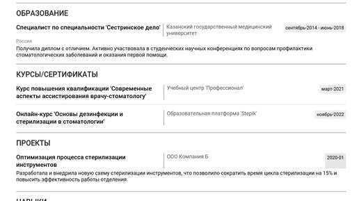 Пример резюме медсестры (ассистента врача-стоматолога) 2025 - Советы