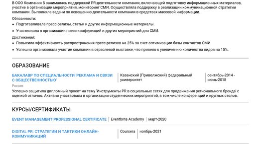 Пример резюме специалиста по связям с общественностью — ваш гид по созданию документа, который выделит вас среди других кандидатов. Изучение готовых примеров и пошаговых инструкций поможет составить эффективное резюме и получить работу мечты. 🚀 На этой странице представлен детальный пример резюме специалиста по связям с общественностью, который поможет вам понять структуру и наполнение идеального документа, соответствующего актуальным требованиям работодателей. Вы найдете: Изучив пример, вы сможете создать резюме с помощью нашего конструктора резюме...
