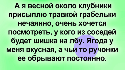 10* историй, Как и Что делать, когда на соседей управы нет. И помощи искать неоткуда. А если попросишь - оберут еще, как липку! История 1 А я весной около клубники присыплю травкой грабельки нечаянно, очень хочется посмотреть, у кого из соседей будет шишка на лбу. Ягода у меня вкусная, а чьи то ручонки ее обрывают постоянно. История 2 Был у нас такой случай на даче. Сосед жаловаться стал, что у него за неделю клубника пропадает. Вроде и не обвиняет, а только чувствую - на моих детей намекает. ...