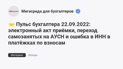 📨 Пульс бухгалтера 22.09.2022: электронный акт приёмки, переход самозанятых на АУСН и ошибка в ИНН в платёжках по взносам