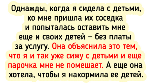 Некоторые родители нанимают няню, когда на самом деле им нужен укротитель львов, уборщица и психолог в одном лице. Но, несмотря на все сложности, многие няни любят свою работу и не готовы менять ее ни на что другое. Мы наткнулись на истории женщин, которые сидят с чужими детьми. Осторожно: в некоторые из них сложно поверить. 1. Однажды, когда я сидела с детьми, ко мне пришла их соседка и попыталась оставить мне еще и своих детей — без платы за услугу. Она объяснила это тем, что я и так уже сижу с детьми и еще парочка мне не помешает...