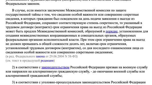 «Каждый может свободно выезжать за пределы Российской Федерации. Гражданин Российской Федерации имеет право беспрепятственно возвращаться в Российскую Федерацию», - гласит ч. 2 ст. 27 Конституции РФ. У этого правила есть исключения. Право на выезд за территорию России может ограничиваться, однако в строго определенных законом случаях. Так, ст. 15 Федерального закона «О порядке выезда из Российской Федерации и въезда в Российскую Федерацию» устанавливает ограничения для следующих категорий лиц: Перечень лиц является закрытым...
