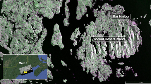 На этом снимке, сделанном 21 августа 2025 года с помощью радара L-диапазона NISAR, виден остров Маунт-Дезерт в штате Мэн. Система радаров с синтезированной апертурой (РСА) L-диапазона спутника для наблюдения за Землей NISAR (NASA-ISRO Synthetic Aperture Radar) сделала этот снимок острова Маунт-Дезерт у побережья штата Мэн 21 августа 2025 года. Тёмные области обозначают воду, зелёные — лес, а пурпурные — твёрдые или ровные поверхности, такие как голая земля или здания. Яркая пурпурная область на северо-востоке острова — это город Бар-Харбор...
