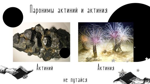 Словарное гнездо АКТИНИЙ - АКТИНИЯ Это слово ошибочно употребляется вместо другого. Значения слов: Акти́ний -один из радиоактивных элементов. Акти́ния - одна из групп кишечнополостных животных класса коралловых полипов...