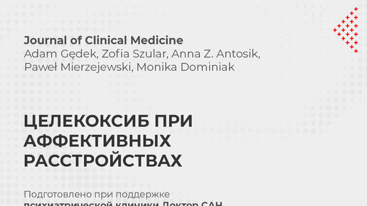 В систематическом обзоре и метаанализе обобщены имеющиеся данные о влиянии целекоксиба на широкий спектр аффективных расстройств и на воспалительные параметры. Обнаружены доказательства, подтверждающие антидепрессивную эффективность целекоксиба в дозе 400 мг/сут, применяемого в течение 6 недель в качестве дополнительной терапии при большой депрессии и мании. Антидепрессивная эффективность целекоксиба в указанной выше дозе при монотерапии также была подтверждена у пациентов с депрессией и сопутствующими соматическими заболеваниями...