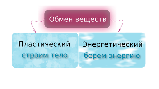 Живые организмы в основном состоят из органических веществ. Большинство органических веществ - это большие сложные молекулы. С пищей в наш организм поступают чужие органические вещества. Организм должен разобрать их на более простые молекулы органических веществ. Из части этих "мелких блоков конструктора" он потом будет собирать собственные органические вещества, которые пойдут на строительство и обновление нашего тела, то есть на биосинтез. Другая часть простых органических молекул расщепляется дальше до неорганических веществ...