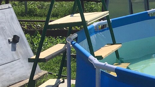 Купили мы себе бассейн, подготовили площадку собрали налили воду все хорошо. Про лестницу забыли, ну думаю стул поставим и будем так залазить, ага это в бассейне должна быть табуретка, да она сразу продырявит дно, оно там тоненькое, армирование у бассейна только боковое. Ну короче с табуреткой не прокатило, стал смотреть лестницы, стоимость конечно раздута, за две гнутые трубки и досочки 6 шт пол стоимости бассейна, что то меня это не устроило, решил посмотреть в инете че народ мастерит, нашел...