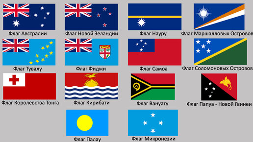 Для некоторых государств Океании характерно размещать на своём флаге Южный Крест - это созвездие южного полушария неба, легко узнаваемый астеризм (легко различимая группа звёзд), означающий, что страна находится в Южном полушарии. Южный Крест можно увидеть на флагах Самоа, Папуа - Новой Гвинеи, Австралии, Новой Зеландии. Флаг Палау напоминает флаг Японии в других цветах (жёлтый диск на голубом фоне), однако символизирует он не солнце, а луну. И диск смещён к древку, подобно флагу Бангладеш. Полная луна указывает время, подходящее для ловли рыбы, рубки деревьев, сбора урожая...