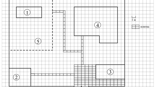 Первое задание в этой части. Внимательно читайте условие Условие задачи На плане изображено домохозяйство по адресу с. Сосновое, 2-й Зелёный пер, д. 9 (сторона каждой клетки на плане равна 1 м). Участок имеет прямоугольную форму. Выезд и въезд осуществляются через единственные ворота. При входе на участок слева от ворот находится сарай, а справа — гараж. Площадь, занятая гаражом, равна 32 кв. м. Жилой дом находится в глубине территории. Помимо гаража, жилого дома и сарая, на участке имеется теплица, расположенная на территории огорода (огород отмечен на плане цифрой 5)...