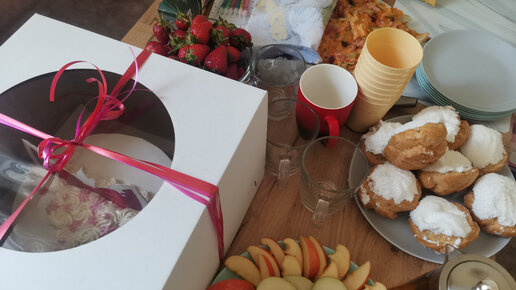 По опыту предыдущих чаепитий во дворе я знала, что накрывать большой стол и готовить разные "традиционные" блюда нет смысла. Дети что-то съели и убежали играть, потом они вернулись только через три часа что-то съесть и посидеть пять минут. За столом сидели только взрослые. Иии... Фото стола я тоже не сделала )) Есть только вот такое, когда уже почти всё подготовили к выносу, так сказать "на низком старте". Торт заказали в кондитерской, очень вкусный "Молочная девочка", но с нужным нам оформлением...