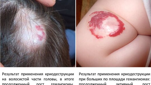 Криодеструкция ("лечение жидким азотом") – это метод удаления новообразований на коже путём их разрушения жидким азотом. Данный вид лечения младенческих гемангиом очень распространён на территории России и стран СНГ, латинской Америке, но уже более 30 лет не используется в европейских странах и в США. Данным методом можно лечить поверхностные младенческие гемангиомы небольших размеров...