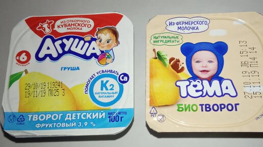 Моей младшей дочери чуть больше года, поэтому к ее питанию я отношусь весьма щепетильно. Сегодня я хочу сравнить детские творожки с наполнителем "груша" двух разрекламированных брендов - "Агуша" и "Тема". Зачем я это делаю? Просто, хочется понять, какой из этих двух продуктов лучше по цене, качеству и вкусу. Итак, в "Пятерочке" я купила два детских творожка "Груша". У них одинаковая масса - 100 гр, но цена разная - баночка "Агуши" - 28,99 руб, а "Тема" - 30,99 руб. Разница уже есть. Продолжим. На обеих баночках указано, что содержимое изготовлено из самых качественных продуктов...