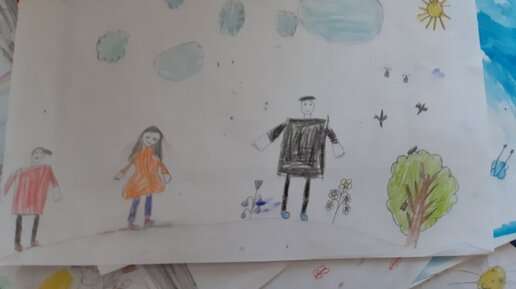 Серёжа перед поступлением в 1 класс нарисовал свою семью. По рисунку можно многое увидеть и узнать о семье. Обязательно надо задать ребёнку несколько вопросов, чтобы уточнить некоторые моменты, после того, как рисунок будет готов. Что сразу бросается в глаза? Рисунок изображён в ярких тонах. На рисунке мы видим трёх человек: папу, маму и Серёжу. Все они находятся на расстоянии друг от друга, причём Серёжа нарисовал себя ниже остальных. На картинке присутствуют облака, солнце, дерево, цветы, птички, бабочки...