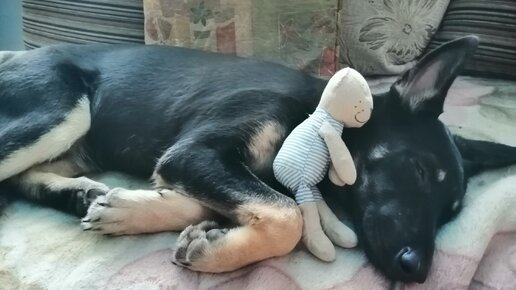 Наша найденая девчуля растёт не по дням, а по часам 😊. В росте уже Гердусю догоняет, да и по весу уже почти догнала - уже 21 кг весит (Герда, к слову, 25 кг осенью была). И, конечно, уже научилась доставать всё, что не приколочено с полок и со стола. Конечно, по сравнению со многими собаками-хулиганками, она у нас ведёт себя более или менее нормально. Днем и вечером, на прогулках она бесится и хулиганит с любимым дружбаном - Люксиком и с Гердусей Днём, после прогулки дрыхнет, как бегемот, в обнимку с игрушками, но ночью за всем не уследишь 😊 и иногда, когда ей не спится, случаются казусы...