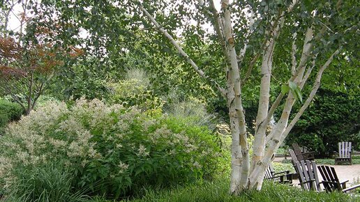 В статьях я читал, что береза - это дерево-"насос": она способна выкачивать за сутки из почвы до 200 л воды, а ее поверхностная корневая система душит всё, что растет ближе пяти метров к стволу. Но читать - это одно, а вот видел я в садах совсем другое. На верхней фотографии из сада Wollerton Old Hall наблюдаем чубушник Aurea, многорядник, купену, бруннеру, дицентру. Я бы не сказал, что все эти растения хорошо переносят недостаток влаги. А вот еще одно фото оттуда же. Под березой сидят бутень жестковолосистый Roseum, киренгешома, купена и один из серебристых сортов кочедыжника...