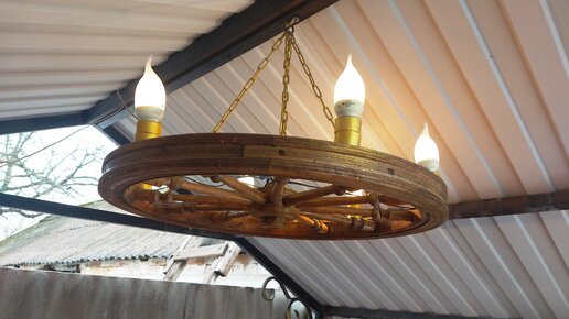 Как из колеса старой прялки сделать винтажную люстру в беседку или гараж