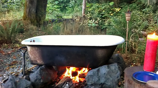 Ванна Не секрет, что судьба почти половины старых ванн — оказаться на даче. Cамый распространённый вариант её вторичного применения — закопать в землю и превратить в мини-прудик. Однако ванна ещё может послужить по прямому назначению! А если точнее, её можно превратить в настоящий банный чан. Сделать его совсем несложно — установите ванну на устойчивое основание, чтобы под ней можно было развести костёр для нагрева воды. Оформление бани под открытым небом — дело вкуса. Можно оставить как есть, но, если применить фантазию, может получиться очень даже симпатичная оригинальная конструкция...