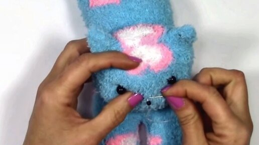 Вот такого милого пушистого друга можно сшить для дочки или сыночка, а может даже для себя любимой, всего за несколько минут. Нам понадобятся пара махровых носков приятной расцветки. Выворариваем носок на изнанку, укладываем пяточкой вверх и рисуем маркером будущие лапки. Стоит заметить, что передние и задние лапки должны находиться на разном расстоянии от пятки. Передние лапки - это те, которые находятся у носочка. Как видите, расстояние у передних лапок до пятки больше, чем у задних. По линии маркера сшиваем носок, затем отрезаем лишнее...