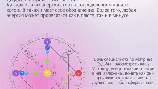 Матрица судьбы - это система самопознания, основанная на объединении нумерологии, психологии и таро. Судьба - это набор выборов, которые открываются перед тобой, исходя из предыдущего опыта души; это цепочка причинно-следственных связей, где каждый твой шаг рождает новое событие. Когда ты проходишь испытания достойно, жизнь перебрасывает тебя на новый уровень. Метод матрицы не предсказывает будущее, он отвечает на вопрос “почему” и “для чего”, например: ”Почему у меня не получается построить гармоничные отношения?”, “Почему нет денег?”, “Для чего мне эта ситуация?” и т...