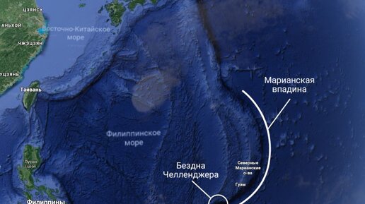 На самом деле Марианская впадина - это не внезапно обрывающееся дно океана, уходящее в бесконечную бездну, не яма, которая хоть и очень глубока, но имеет небольшую площадь. На самом деле - Марианская впадина - это целый жёлоб (по другому она и называется Марианский жёлоб) в форме полумесяца, который простирается на 2500 километров американского острова Гуам до побережья Филиппин. Самая глубокая точка, так называемая "бездна Челленджера" ("Challenger Deep"), расположена на глубине 10994 метра (это последние уточнённые данные, ранее называлась цифра 11034 метра)...