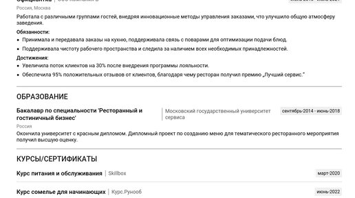 Найти работу мечты поможет грамотно составленное резюме! Наш пример резюме Официанта покажет, как эффективно презентовать свой опыт и навыки, чтобы получить приглашение на собеседование. Изучив готовые примеры, вы узнаете, как составить резюме, отвечающее требованиям работодателей. Мы предлагаем подробные пошаговые инструкции для каждого раздела: Изучив пример, вы сможете создать резюме с помощью нашего конструктора резюме. Заголовок резюме должен быть четким, профессиональным и отражать вашу специализацию...