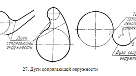 11.1 Сопряжения. Контур многих деталей машин и приборов состоит из прямых линий и дуг окружностей с плавными переходами от одной линии к другой. Итак, плавный переход одной линии в другую называется сопряжением. Эта дуга называется дугой сопрягающей окружности (рис.27). Радиус этой окружности – это радиус сопряжения. Центр этой окружности – это центр сопряжения. Точка, где одна линия переходит в другую – это точка сопряжения. Сопряжение прямой линии и окружности и сопряжение окружности с другой окружностью бывает внешнее, внутреннее, смешанное (рис...