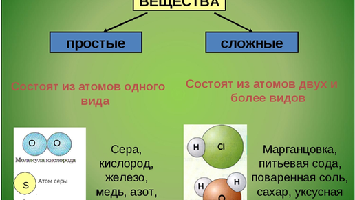 Всем доброго времени суток! В прошлый раз мы узнали, что молекулы могут состоять как из атомомв одного элемента, так и из атомов разных элементов. Теперь немного классификации: Вещества, молекулы которых состоят из атомов одного элемента, называются простыми веществами. Стоит сделать оговорку. Примерами простых веществ могут служить водород, кислород, азот, хлор и т.д. Эти вещества состоят из двухатомных молекул. Однако далеко не все простые вещества состоят из молекул. Например, все металлы (как простые вещества) состоят из атомов...