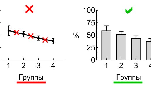Возьмём сразу быка за рога. Посмотрите на то, как делать не надо. Плохо всё: плохие цвета, наличие текстур, разные шрифты, опечатки, неуместное использование теней и объёма, отсутствие усов погрешностей, невнятная отрисовка шкал и много чего ещё. Особенно оцените градиентную рамочку в стиле радуги и фон в стиле обоев. М-м-м!!! Находка! И это фрагмент из реальной диссертации! Хотя бы часть этих ошибок совершают почти все аспиранты и даже немалое число профессоров. И даже если бывает, что график на первый взгляд не выглядит смешно и пугающе, то ещё не факт, что с ним всё хорошо...