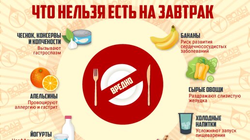 В данной статье мы приводим список продуктов, употребление которых на «пустой» желудок с утра или перед сном вредят вашему здоровью.Какие же продукты нельзя есть натощак? ТОП 10 продуктов для завтрака Вода на завтрак Перед завтраком натощак полезно пить чистую воду или травяной чай. Употребление воды до еды должно стать обязательной полезной привычкой. Это касается не только завтрака, но и всех приемов пищи. Дневной прием жидкости начните утром: выпейте натощак стакан теплой воды. В течение дня старайтесь пить воду через равные промежутки времени...